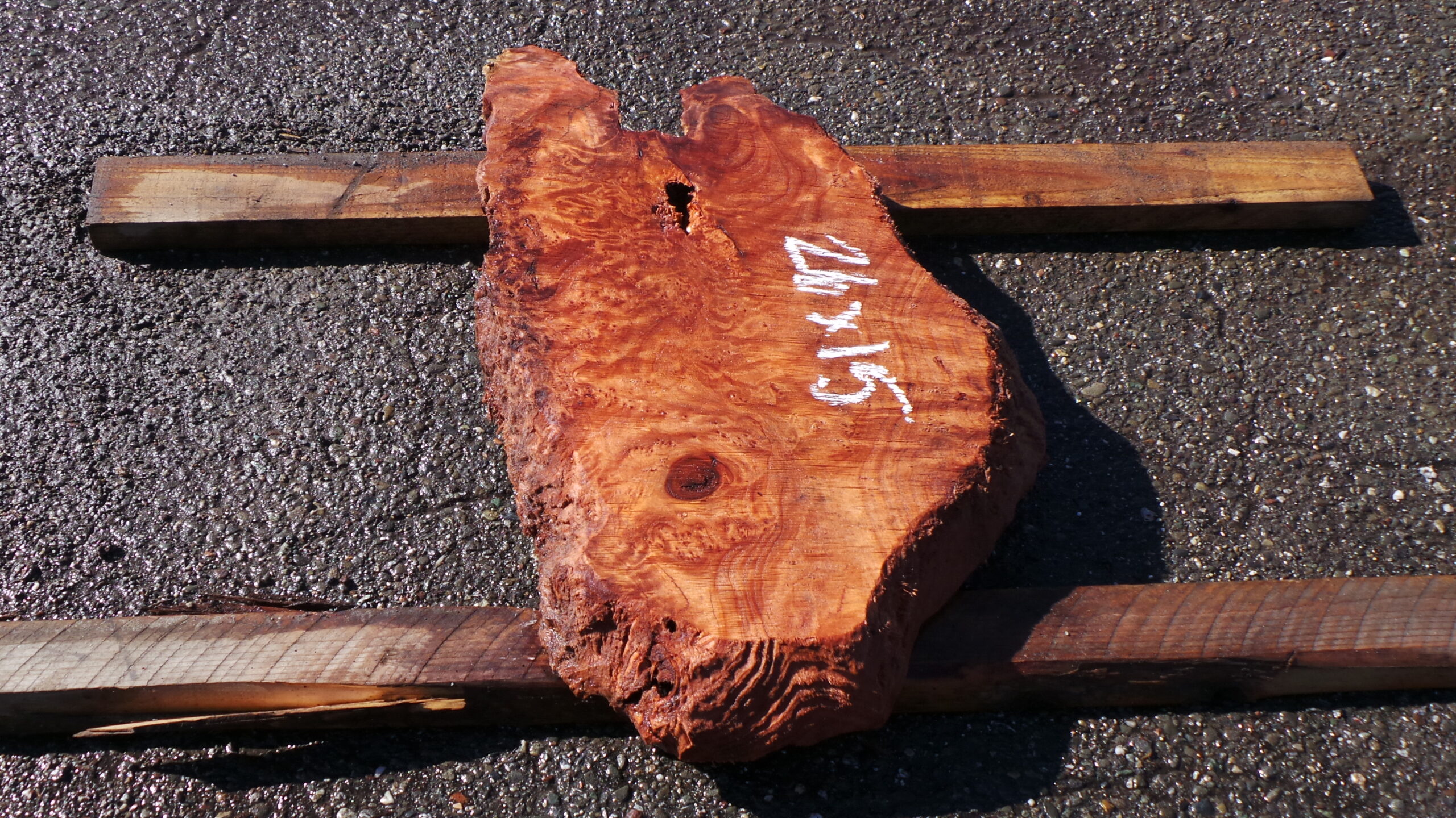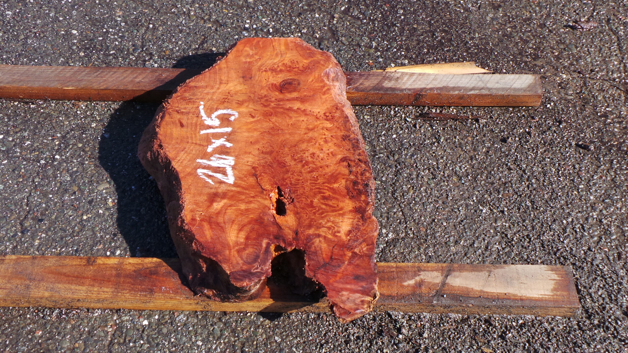 The slab features rich, fiery red tones with swirling burl figure, intricate curl patterns, natural voids, and knots that tell the story of its growth. While unpolished and unfinished, it has been lightly misted with water in the photos to reveal the full vibrancy and depth of the grain—bringing out the mesmerizing swirls, bold color contrasts, and chatoyant shimmer that make redwood burl so coveted. This water misting gives a preview of its potential when finished, while keeping it in its raw, authentic state.With its compact yet bold live edge shape, prominent burl eyes, small natural voids, and beautifully textured surface, this slab is ideal for creating a versatile statement furniture piece that blends rustic charm with timeless elegance.