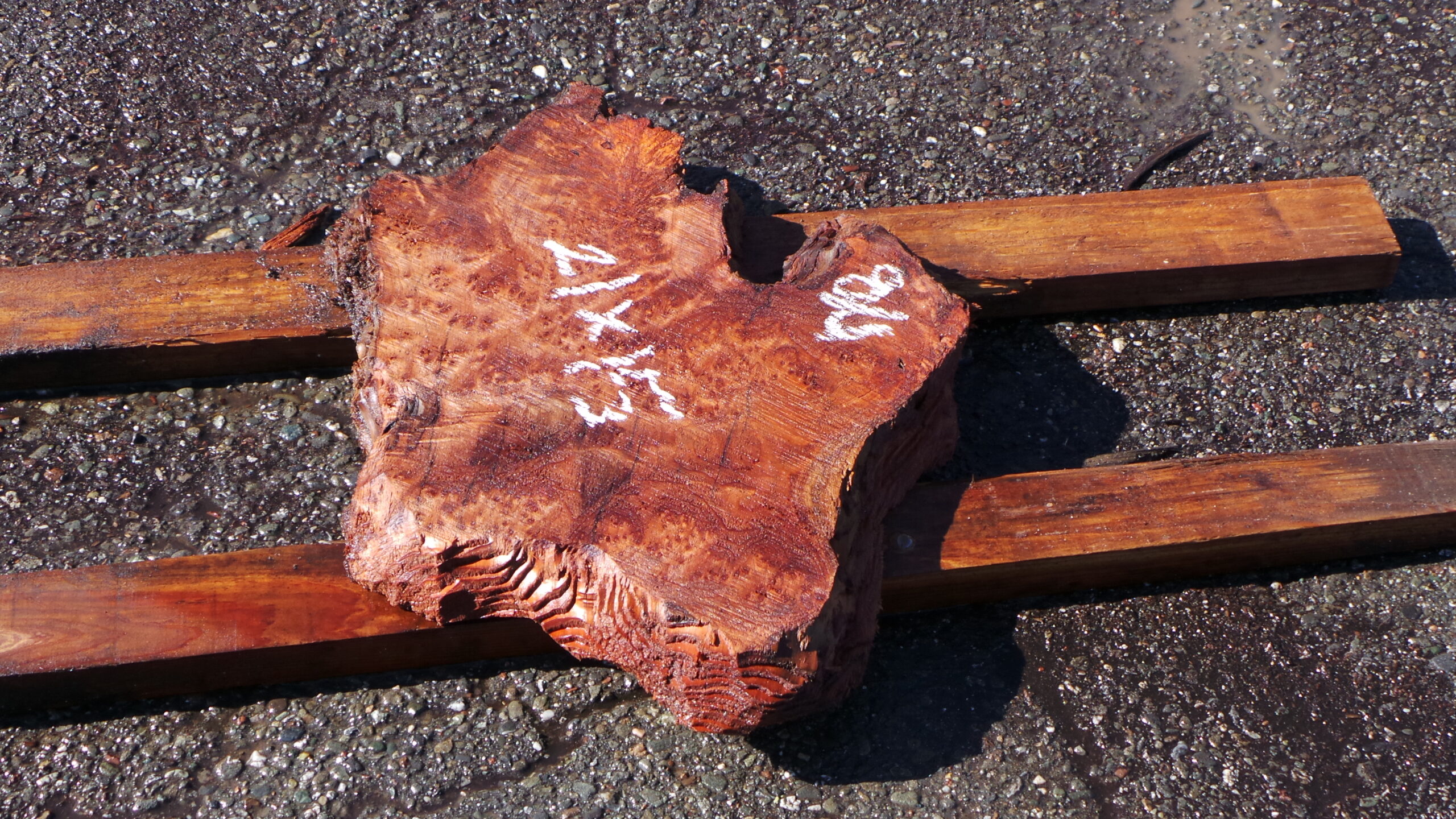 The slab features rich, fiery red tones with swirling burl figure, intricate curl patterns, natural voids, and knots that tell the story of its growth. While unpolished and unfinished, it has been lightly misted with water in the photos to reveal the full vibrancy and depth of the grain—bringing out the mesmerizing swirls, bold color contrasts, and chatoyant shimmer that make redwood burl so coveted. This water misting gives a preview of its potential when finished, while keeping it in its raw, authentic state.